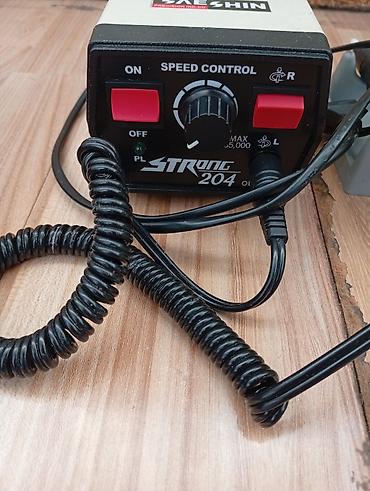 - Фрезер Saeshin Strong 204: блок управления с регулировкой скорости до 35 000 об/мин, переключатели реверса (R/L), ручка-микромотор, подставка и спиральный шнур.