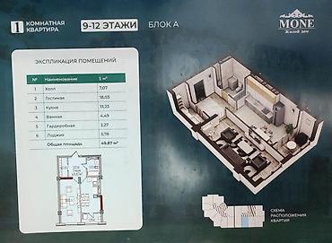 1‑комнатная квартира в Тундук -1 от СК КУТ СТРОЙ❗️❗️❗️ ЖК находится напротив нового Ошского рынка! 🔥 Сдача в июне 2026 🏬 -Этаж 4й Общая площадь — 49,3 м². Планировка продуманная и функциональн...