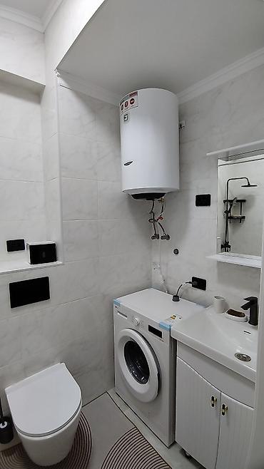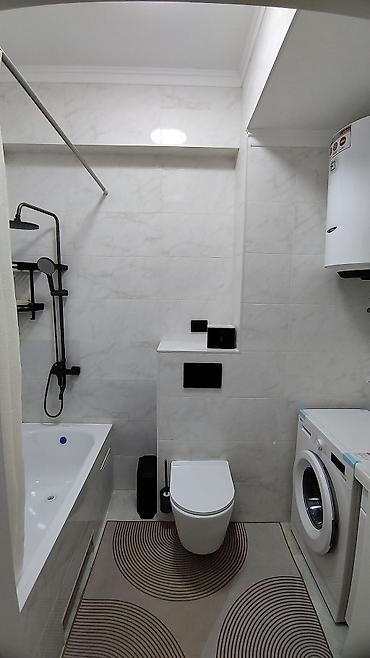 - Санузел совмещённый: ванна с душевой системой «тропический дождь» и ручной лейкой, подвесной унитаз с инсталляцией, стиральная машина и водонагреватель, ниша‑полка, плитка «под мрамор».
