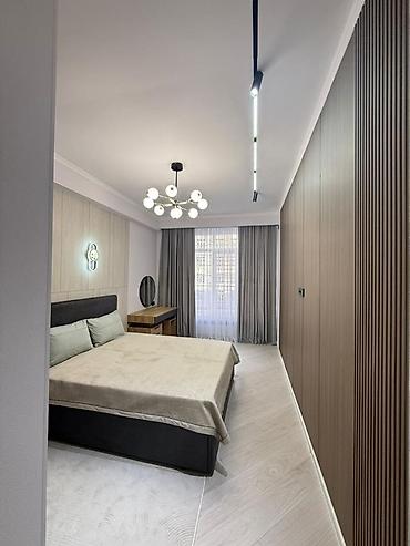 - Просторная спальня с большой двуспальной кроватью, встроенным шкафом-купе, туалетным столиком и декоративным настенным светильником.