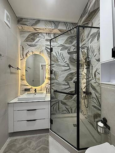 - Стильный санузел с душевой кабиной из закалённого стекла, черной фурнитурой, подвесной тумбой под раковину и подсветкой зеркала.