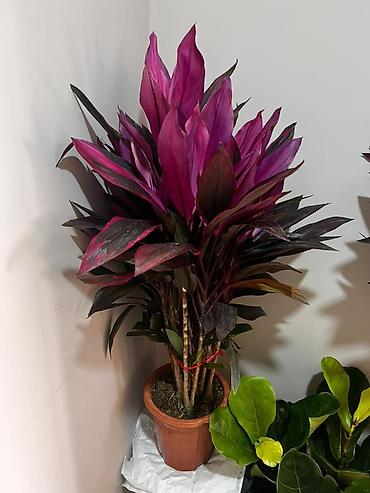 - Кордилина терминалис (Cordyline fruticosa/terminalis) с эффектной бордово‑пурпурной листвой. Декоративный куст на нескольких стволиках. Нужен яркий рассеянный свет для сохранения окраски. Полив регулярный, без застоя воды; влажный воздух, периодическое опрыскивание. Питательная, слегка кисловать почва, хороший дренаж.