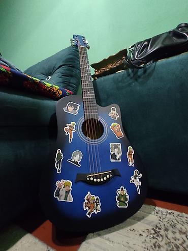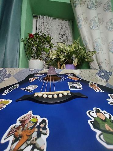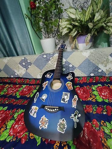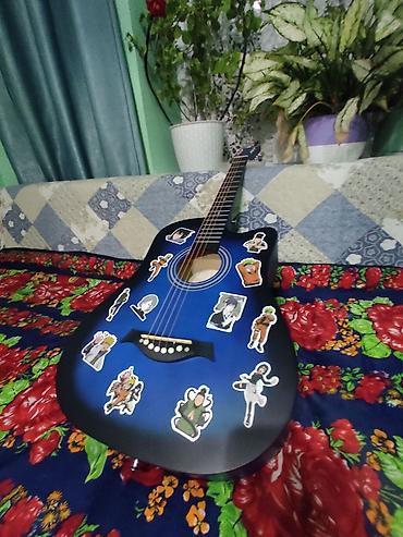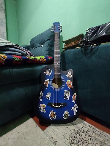 Акустическая гитара 6-струнная, корпус дредноут с вырезом. Цвет: синий градиент (blueburst). Верхняя дека, обечайка и задняя дека в едином цвете; гриф тёмный, накладка с 18 ладами и стандартной разметкой. Колки металлические, хромированные, открытого типа; нижний порожек с декоративными белыми «пинами». На корпусе наклеены тематические стикеры в аниме‑стиле (можно снять/заменить по желанию). Подойдёт для обучения, аккомпанемента и домашних выступлений. Настраивается классически в EADGBE. Яркий внешний вид, удобный доступ к верхним ладам благодаря вырезу.