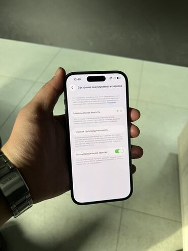 IPhone 14 Pro (фиолетовый) - Аккумулятор: на скриншоте в настройках отображается “Состояние аккумулятора — Максимальная ёмкость 85%”, активирована “Оптимизированная зарядка”. Состояние идеальное...