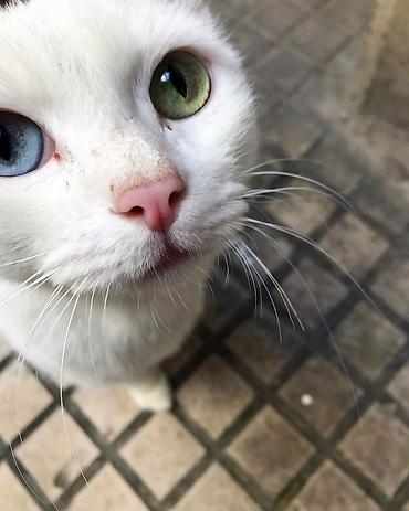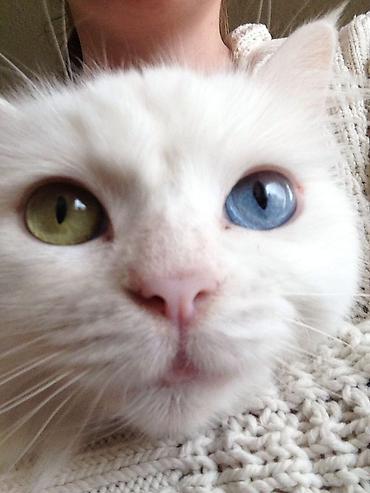 Белоснежная кошка парода Турецкая Ангора уезжаем за границу из за этого срочно продаем милая нежная чистоплотная девочка, с редкой гетерохромией глаз: один глаз голубой, второй оливково‑зеленый. Плотная белая шерсть без рисунка, розовый нос, длинные белые усы. Компактная мордочка, аккуратные уши.