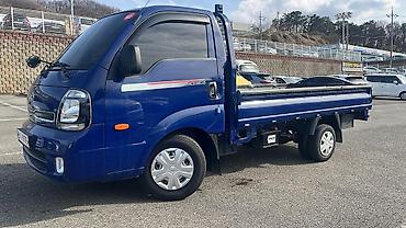 Kia Bongo III — компактный грузовой бортовой автомобиль синего цвета. Характеристики и оснащение: - Тип: малотоннажный бортовой грузовик с высокой металлической надстройкой по периметру кузова. - К...