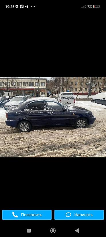 Автомобиль Chevrolet Lanos в кузове седан синего цвета. Салон оснащен механической коробкой передач и приборной панелью темного цвета. Сиденья выполнены из серой тканевой обивки. На рулевом колесе расположен логотип Chevrolet. Экстерьер автомобиля дополняют легкосплавные диски. Машина покрыта снегом, что указывает на эксплуатацию в зимних условиях.