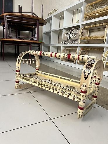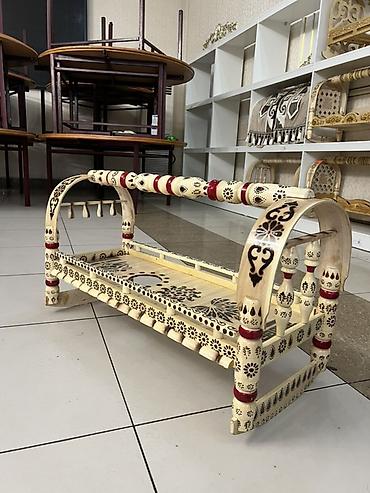 Размеры ориентировочно по фото: невысокая, рассчитана на размещение матрасика/подстилки внутри ложа. Прочная, красивая, с богатой резьбой и орнаментом.