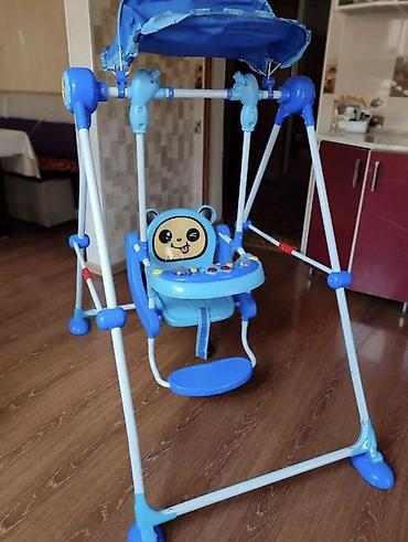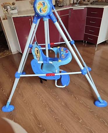 Детские напольные качели с подвесным сиденьем и козырьком.