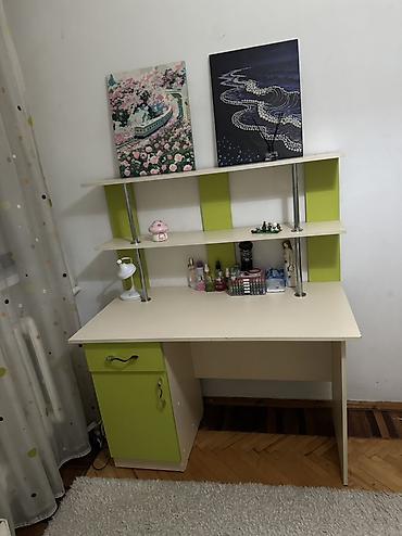 Детский/подростковый мебельный комплект в зелёно‑кремовой гамме. Состав: - Письменный стол с фигурной столешницей. Слева тумба на 3 выдвижных ящиках с ручками‑скобами, справа отделение с дверцей и...