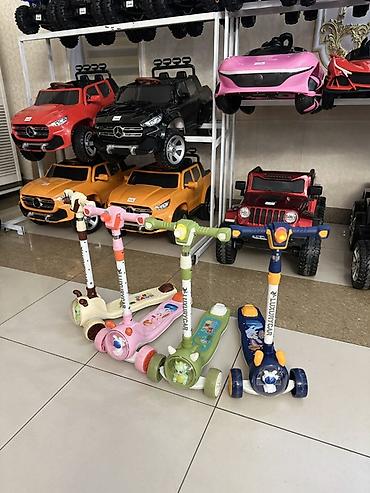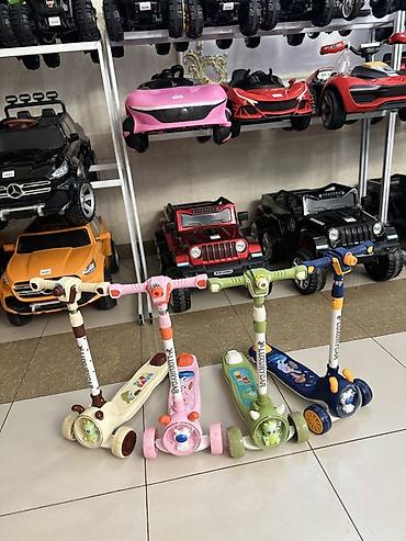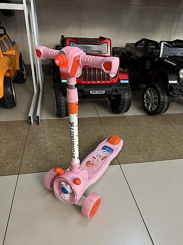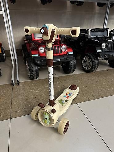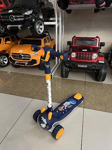 - Модель: трехколесный самокат с передними колесами-повторителями и светящимся «носом»-фонарём спереди.