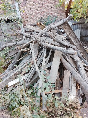 - Большая куча смешанных древесных материалов: поленья и ветви среднего диаметра, доски разной длины и толщины, рейки, бруски.