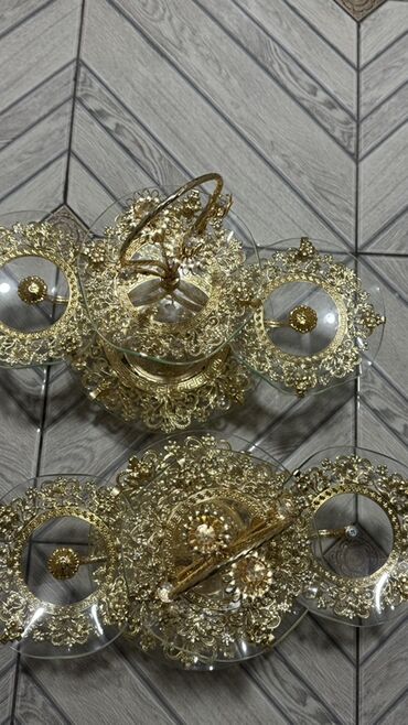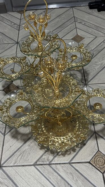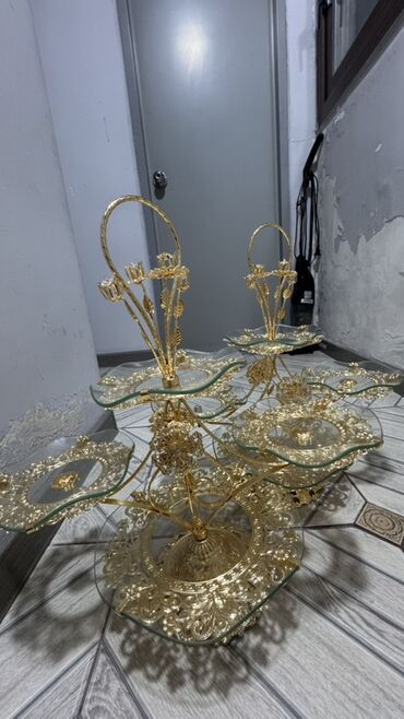 - Материал: металл с золотистым покрытием + прозрачные стеклянные блюда.