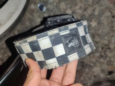 - Фиксация ног: ремни на педалях с шахматным принтом, на одном ремне нашивка с логотипом (см. фото крупным планом).