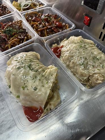 - Разнообразное меню домашней кухни: мясные рагу в соусе, курица с овощами, гуляш, макароны с сосисками и яйцом, рисовые гарниры, картофельное пюре, лапша по‑домашнему, порционные изделия из теста с начинкой.