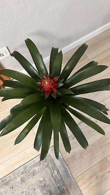 - Экзотическое комнатное растение из семейства бромелиевых с розеткой длинных глянцевых листьев и ярким центральным соцветием красно‑оранжевого оттенка.