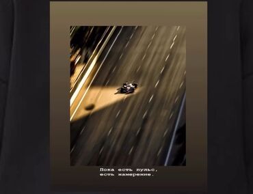 - Принт спереди: фотография мотоцикла на пустой магистрали; внизу надпись «Пока есть пульс, есть намерение»