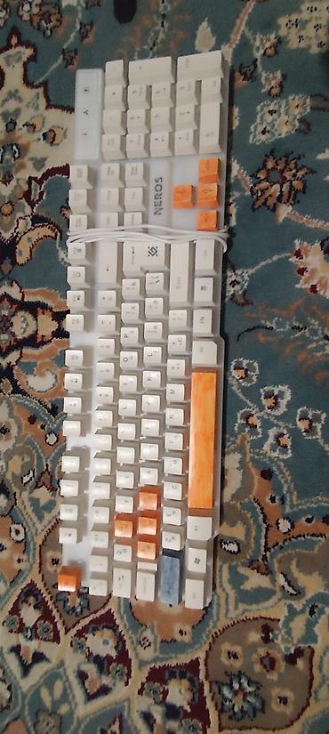 - Клавиатура полноразмерная NEROS (раскладка RU/EN). Белые кейкапы с оранжевыми акцентами, цифровой блок, стрелки и функциональные клавиши. Проводное подключение через USB, съёмный/фиксированный кабель (на фото выведен по центру).