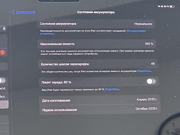 - Аккумулятор: максимальная ёмкость 100%, 49 циклов перезарядки