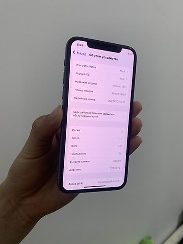 На скриншоте “Об этом устройстве” видны: iOS 18.5, модель iPhone 11 Pro, объём 256 ГБ, установлено 24 приложения, 517 фото, 111 видео. Цвет корпуса и модуль камер соответствуют линейке 11 Pro.