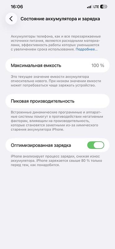 - Аккумулятор: максимальная ёмкость 100%, включена «Оптимизированная зарядка»