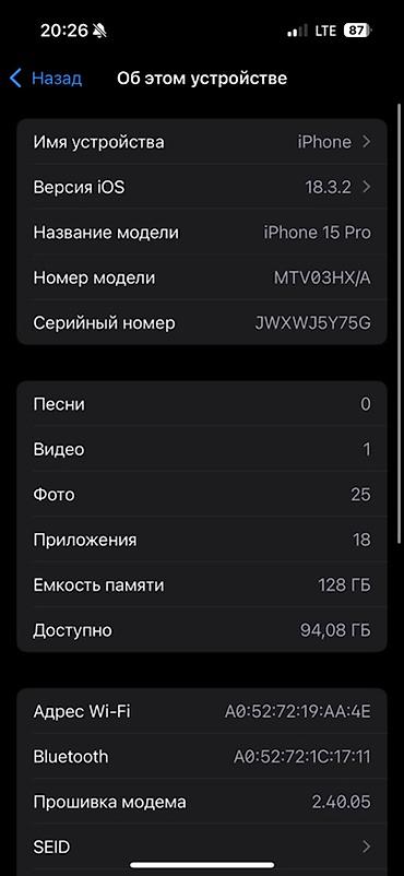 IPhone 15 Pro, 256 ГБ, синий Характеристики по фото экрана: - Модель: iPhone 15 Pro (номер модели MTV63KH/A) - Память: 256 ГБ (доступно ~207 ГБ) - iOS: 26.0.1 - Количество: фото — 410, видео — 26,...