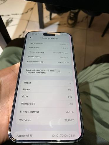 IPhone 15 Pro Max, 256 ГБ, цвет чёрный (титановый). На экране «Об этом устройстве» указано: