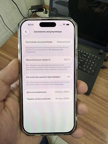 - Аккумулятор: максимальная ёмкость 100%, количество циклов перезарядки 50, состояние «Нормальное»