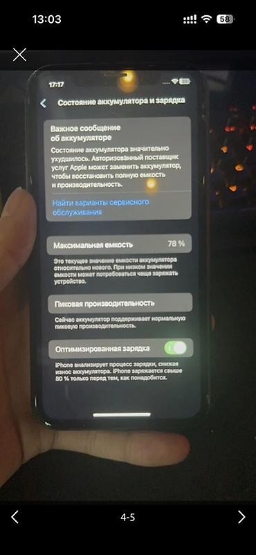 - Состояние аккумулятора по настройкам: максимальная ёмкость 78%, активна функция «Оптимизированная зарядка»; отображается системное уведомление о необходимости сервисной замены для восстановления полной ёмкости и производительности