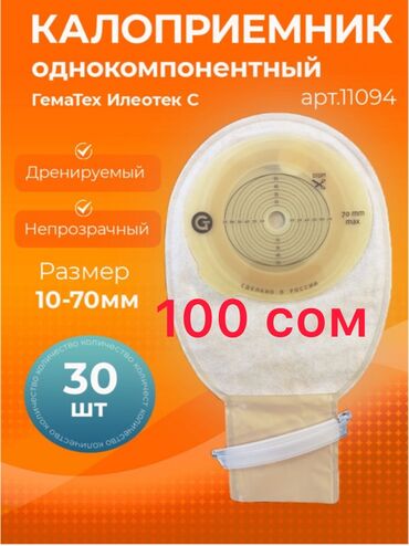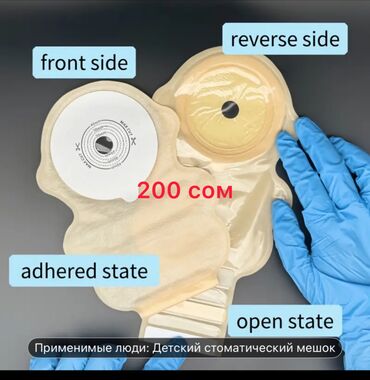 Также в наличии детские стомические мешки (показаны варианты: front side, reverse side, adhered/open state).