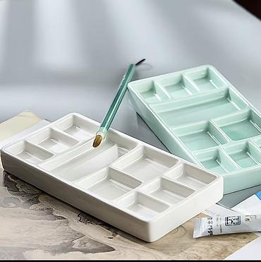 - Материал: плотная керамика с гладкой глазурью — не впитывает пигменты, легко промывается и не царапает кисти.