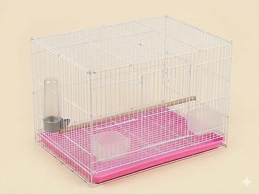 - Просторная прямоугольная клетка с металлическими прутьями белого цвета и глубоким пластиковым поддоном розового цвета.