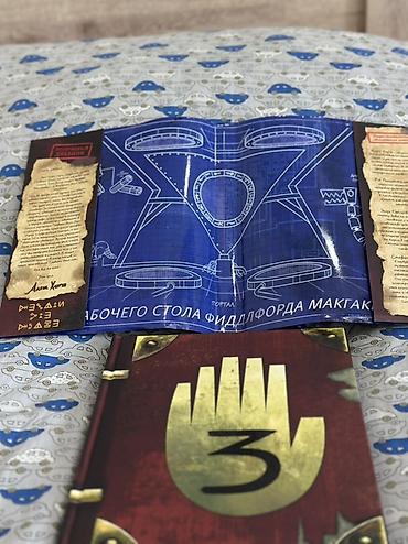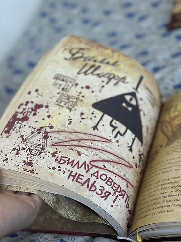 - Внутри — записи, заметки, рисунки и «секретные» страницы из мира Гравити Фолз: существа, шифры, схемы и предупреждения.