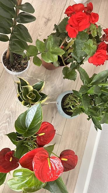Все растения в индивидуальных горшках, листва здоровая и насыщенно‑зелёная, цветущие экземпляры с яркими красными соцветиями. Подойдут для офиса и дома, просты в уходе и создают выразительные акценты интерьера.