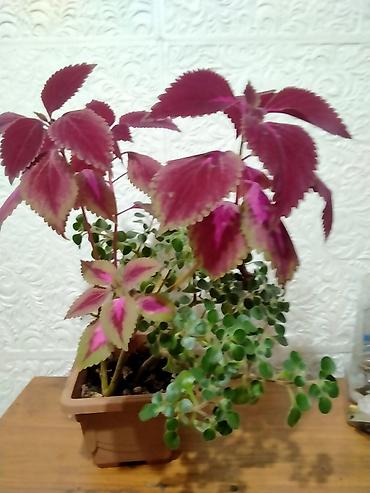 - Декоративно-лиственная композиция: колеус с яркими бордово-розовыми листьями с зубчатым краем + ампельное суккулентное растение с округлыми зелёными листочками.