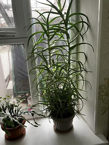 2) Алоэ (суккулент, высокорослая форма) — взрослое растение в светлом пластиковом кашпо с поддоном (около Ø 18–20 см). Много пунктированных листьев с мягкими зубчиками, сформирован ствол с боковыми розетками у основания.