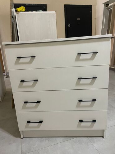 - Комод на 4 выдвижных ящика. Корпус и фасады — белые, лаконичный современный дизайн. Удобные матовые черные ручки, плавное скольжение ящиков. Компактная глубина — удобно для небольших помещений.