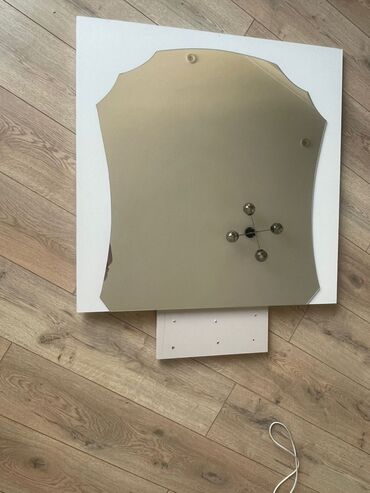 - Настенное зеркало фигурной формы в ретро-стиле. Крепление на декоративных держателях; на фото — зеркало вместе с монтажной панелью-основанием.