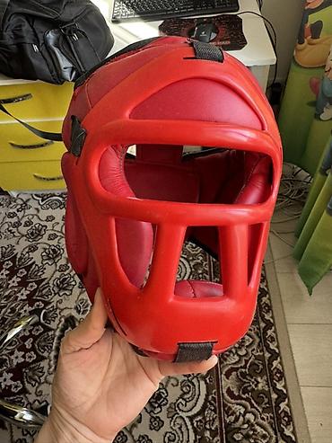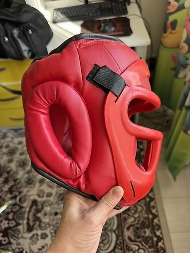 - Защитный шлем с решёткой/маской, красный. Полное закрытие подбородка, скул и лба, широкие обзорные окна. Мягкие внутренние подушки, жёсткая внешняя маска, фиксация ремешками-липучками.