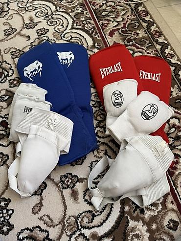 - Накладки на голень и стопу: пара красных Everlast и пара синих Venum. Эластичные, с амортизирующим наполнителем, для тренировок и спаррингов.