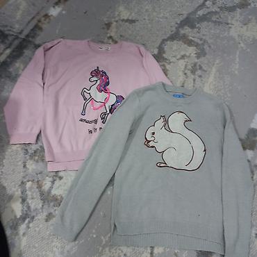 - Два вязаных свитера: розовый с крупным принтом единорога; светло‑серый с принтом белочки. Круглая горловина, манжеты и нижняя резинка в рубчик.