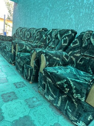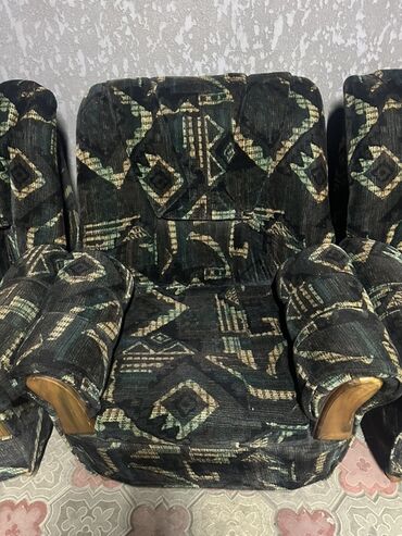 - Обивка: велюровая/флоковая ткань темно‑зеленого цвета с геометрическим орнаментом.