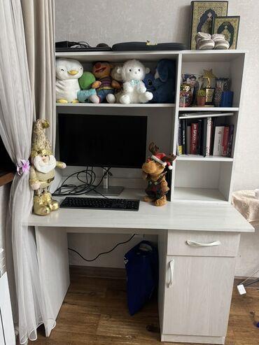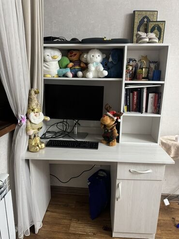 В комплекте: только стол с надстройкой и встроенные полки. Остальные предметы на фото — для иллюстрации.