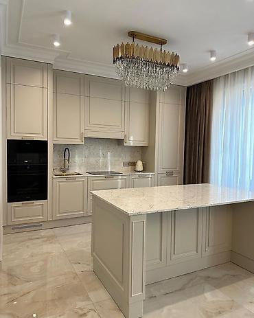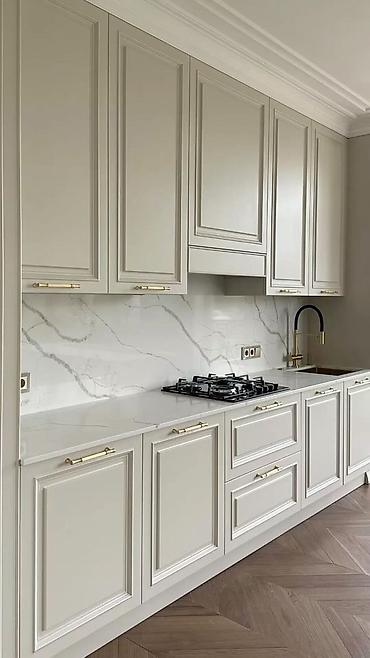 Идеально для интерьеров неоклассика/классика: строгая геометрия, каменная поверхность, латунная фурнитура, возможность комплектации островом и встроенной техникой.