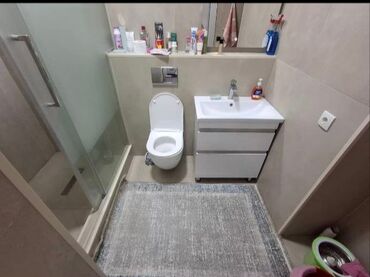 - Санузел с душевой кабиной со стеклянными дверями, инсталляцией, подвесной тумбой с раковиной и зеркалом, керамической плиткой на полу и стенах.