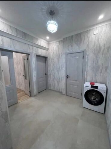 - Просторный холл с несколькими изолированными входами в комнаты, потолочными светильниками и декоративной люстрой. В коридоре установлена стиральная машина.