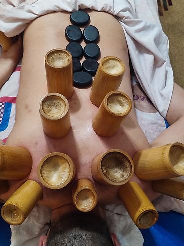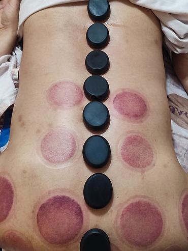 - Баночный массаж спины бамбуковыми и деревянными банками: проработка мышц вдоль позвоночника и плечевого пояса, вакуумная постановка с фиксированием по зонам. На коже остаются характерные круглые следы от вакуума.