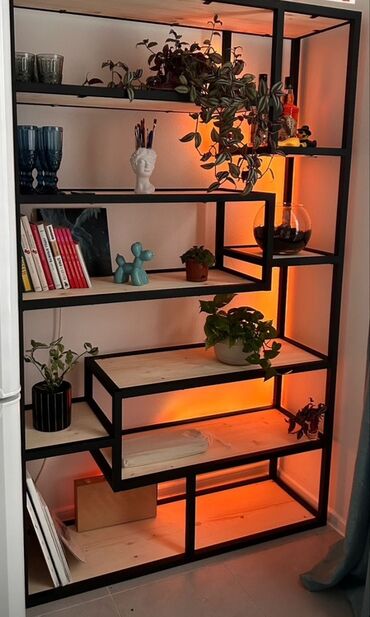 - Полки: ровные широкие поверхности для книг, декора, растений, посуды, винила и аксессуаров. Возможность комбинировать с деревянными или стеклянными вставками/подсветкой (пример на фото).