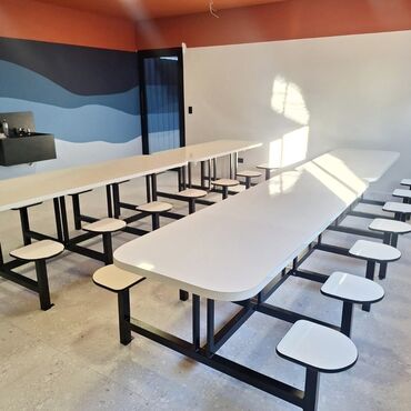 - Столы со встроенными индивидуальными сиденьями на общем основании (решение для школ, заводских и корпоративных столовых).