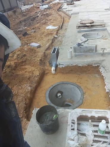 - Подготовка основания и бетонирование площадок под люки, установка ливнеприёмников и точечных водосборников.